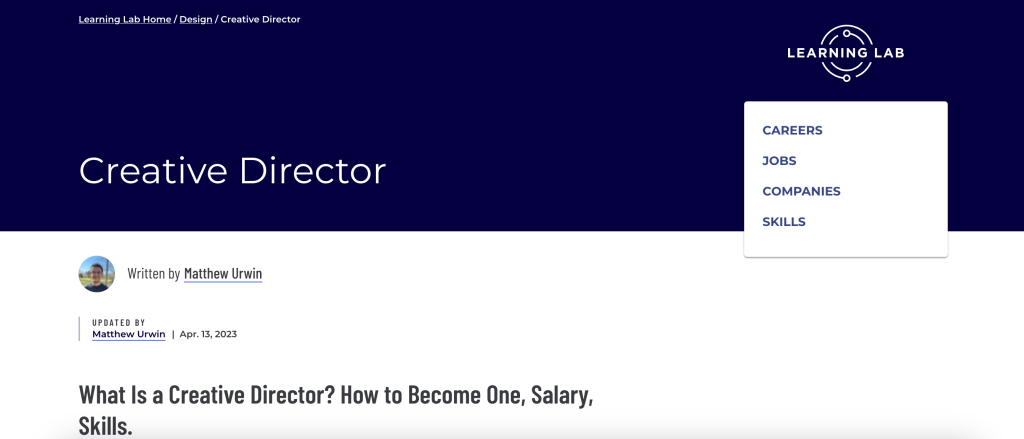 I also developed and updated content for Built In’s Career Pages project as part of the Learning Labs initiative. I followed a team-designed template to restructure this career page for a creative director job title, breaking up the text into more readable sections that feature concise paragraphs and bullet lists.