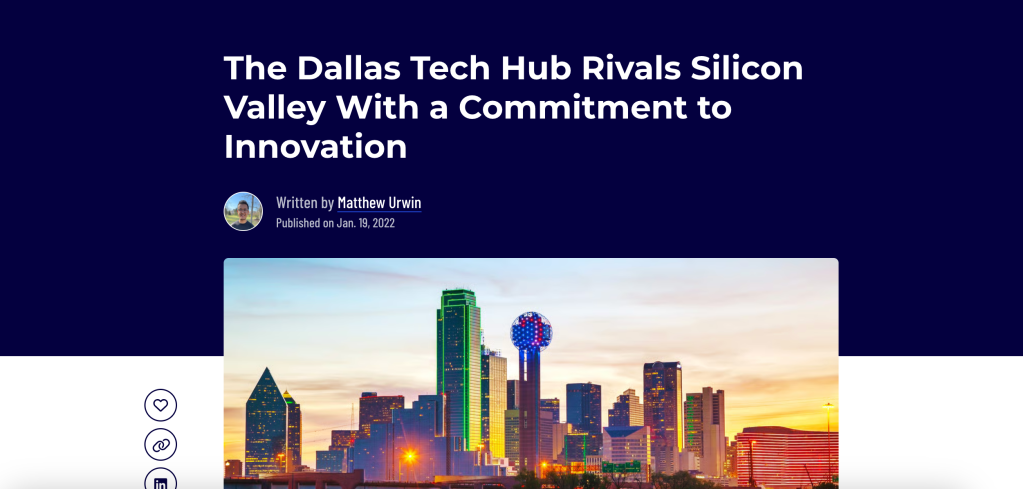 Similar to the Atlanta tech hub piece, I emphasize efforts in Dallas to accelerate the city’s tech transformation. I am especially proud of conducting research on local initiatives to beautify the downtown area and share tech skills with various communities.